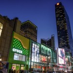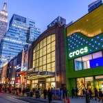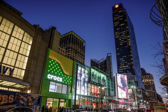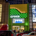 Crocs teamed up with TPG Architects to design a bold new exterior for its 13,000-square-foot space, nestled in the heart of Manhattan just west of the Empire State Building. The final product is a quintessential Crocs look, incorporating the company’s trademark bright colors with backlit, clear globes to create a shoe-like storefront, complete with its very own set of Crocs’ signature ventilation holes.