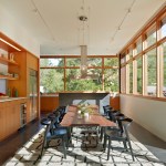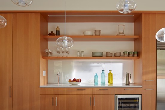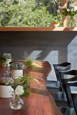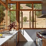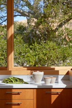The kitchen of this 3,200 square foot home in Nicasio, California cleverly downplays most of its practical functions, not by hiding them, but by seamlessly integrating them with the surrounding indoor and outdoor areas. What emerges is less of a well-define traditional “kitchen” than a series of fluid spaces integral to movement through the house. In this sense, one doesn’t look at the kitchen as an isolated room so much as through it to something far better beyond.