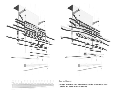 Overall, the project’s intent is to intensify an awareness of the natural systems that surround us, particularly their tendency towards movement and change, in order to foster a constant desire to move through the building and back out into the surrounding landscape. The title of the project, Crook | Cup | Bow | Twist (categories of wood deformation) refers conceptually to the latent potential energy in all natural systems towards movement and highlights our often futile attempts to fight against it. By making present these gestures of the natural world, we set in motion new ways of reading and experiencing our environment — a critical agenda for the next generation of sustainable architecture. As an integral piece of this home, we tried to design even the most functional space with this ethos in mind. The kitchen is the knot at the center of movement through the house as well as frame for our focus on the natural world beyond.