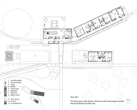 The prime functions sit behind a high counter, which has a backing of steel plate with a natural blued finish that strongly anchors the dining area while maintaining openness and view. We carefully selected this exposed sheet steel for its Rothko-like, painterly and organic feel. Behind the counter are the stove, sink prep area, and entry station for keys and packages. This working area is directly adjacent to the door to the pool terrace and casual family entry and is open on all sides, with views out into the landscape in every direction.