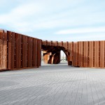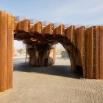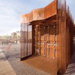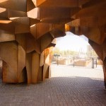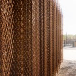 The three containers’ corrugated walls also inspired the pergola that connects them. The designers created an oblong grid of varied hexagonal shapes out of Cor-Ten that web between the tops of the containers. The space below is accessed through arched entries, and the hexagons above are cut at varying heights to form an almost domed ceiling.