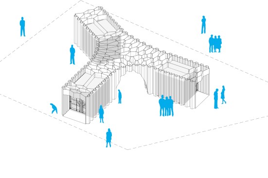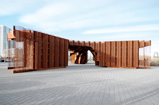 On a budget of just $100,000 (Canadian), 5468796 designed a low-slung Y-shaped structure, covered in rusted metal mesh. Hidden beneath the metal mesh in each of its three arms are shipping containers, providing storage and workspace, as well as a pre-engineered structural form that eliminated the need for expensive foundation work. A honeycomb of Cor-Ten steel sheets connects the containers and creates a mini pergola over the central space between. Three openings invite people to walk under the pergola and through the structure, which is half-building and half-pavilion. “We’re always trying to see the latent potential in projects that allow us to expand the possibilities further,” principal Johanna Hurme says. Here, that potential turned a shed into a pavilion.