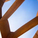 The steel honeycomb forms open to the sky like vertical flues and enable an interesting interplay of light and shadow, pulling sunlight all the way into the space below during different parts of the day, as well as creating pockets of light and dark within the vertical facets of the pergola itself. “There’s something about the quality of light in the prairies that’s so intense. And we have such beautiful access to it that there’s many opportunities to use the primary materials of light and shadow in the project,” Hurme says. “It creates varying conditions on the site and shadows on the ground plane that keeps it alive throughout the cycle of the year.” The space beneath the pergola becomes a kind of gateway, Hurme says, connecting the still-developing East Village to the community garden and playground area, designed by Stantec and Moriyama & Teshima, and to Fort Calgary, a historic public park nearby.