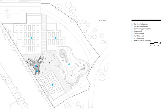 Beyond helping keep costs down, the shipping containers also served to inspire the overall design of the project. The 5468796 team based the approach on the containers’ corrugated sides, using these trapezoidal surfaces to build on and transform the structures’ appearance. This is most evident in the skin that wraps the containers: three layers of metal mesh, each of which mimics that corrugation in different depths and thicknesses. The result is a stratified cage of rusted metal ridges that pop out from the containers’ surfaces by nearly a foot. It’s a way to “blur the edges of the container and expand it out,” Hurme says.