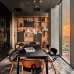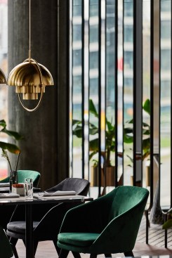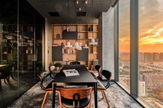Common areas are a reflection of a vibrant city. They are saturated, full of colour and eclectic. They are characterised by richness in finishing materials and exceptional care for details – there is no place for a mistake or coincidence. Furniture is also catching an eye – soft skin, pleasing fabrics combined with a subtle shape of lasting and sturdy tables. Blackness of Cosetino quartz conglomerates used for countertops is an ideal match with seats’ warm brownness and shade of old gold, which is present on lamps and features of furniture. Main motif for a conference centre is in lifestyle spirit – it reminds of a modern command centre filled with modern technologies and yet, it is still cosy.
