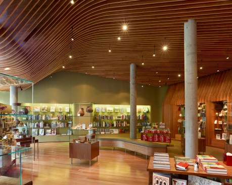 "A series of parallel cherry plywood ribs organizes the museum store and forms the ceiling and millwork on the rear wall. Likened to the ribbed underside of a mushroom known as a lamella, the surface undulates to create an elegant sectional profile. This serves the practical functions of providing shade from the intense western sun while lighting and displaying merchandise. Carpeted display walls terminate the north and south ends of the space with a color and texture to compliment the warm wood floor and lamella surfaces. The form and structure of the lamella resonates with the shapes and geometry of the Crystal Bridges Museum. Here the geometry of the plan is transformed into a three dimensional spatial proposition imbued with local materials and craftsmanship that expresses a kinship with the unique sensibility found in American Art."