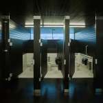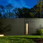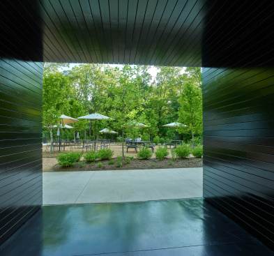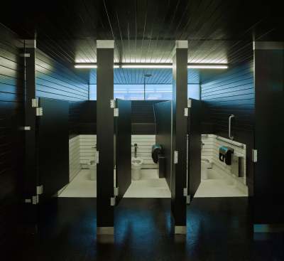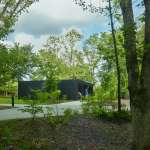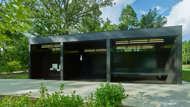 Built along a new sculpture trail at the Crystal Bridges Museum of American Art, the North Trail Biological Pavilion is an exploration in light and material, public and service uses, site and context, infrastructure and architecture. The project was driven by the belief that the facility should aid the CBMAA’s aspirational mission, which seeks to integrate art, architecture and nature. The Biological Pavilion is a highly functional space for trail maintenance and guest restrooms adding conditioned bathrooms, drinking fountains, seating, and maintenance facilities to support seasonal outdoor programming. The building upends conventional approaches to public hygienic facilities by staging dramatic experiences of light and seasonal change — its dark interior selectively allows light in, and the experience is heightened through a focused engagement of color, sheen and reflectivity.