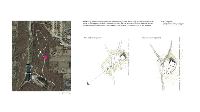 Areas for primary and public use are highlighted while support and services areas recede through shifts in material, color, and sheen. This shift provides a higher level of durability and cleanability in high-use areas while also focusing light in these areas to help orient the user. The location of the buildings was established to minimize disruption on the grounds and provide easy access to building service and maintenance at the museum.