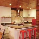 The home’s first-floor footprint is just 588 square feet, so the challenge was utilizing the space to create a functional and efficient kitchen that opened to the dining and living area, as well as to the views beyond. The original 3-foot-thick stacked stone walls were kept as is, exposed on both the interior and exterior of the barn. Structural posts were added on the interior so that the second floor floats above the walls.