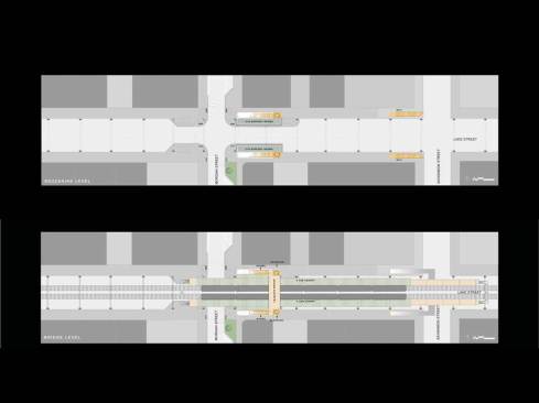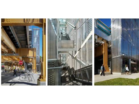 The new stationhouses have been located at grade level at the corner of Morgan and Lake Streets in an effort to maximize station visibility and pedestrian access from the active Randolph Street corridor to the south. New trees, landscaping and artist-commissioned bicycle racks are located along Lake Street in an effort to soften the industrial character of this area. Wide, clear corners at the intersection improve visibility for both pedestrians and drivers, and state-of-the-art surveillance cameras have been installed to improve pedestrian and rider security.