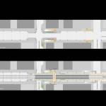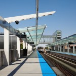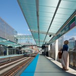 Materials have been chosen to permit visibility through the station and reinforce the feeling of openness. The canopies above the platform level are constructed from translucent polycarbonate panels which provide weather protection for passengers, permit natural light to reach the platform, and with their low weight, allow for less canopy structure, thereby reducing overall cost. The lightweight nature of the panels also allows for easy replacement. The transfer bridge, elevator enclosures and grade level entries are comprised mostly of transparent glazing, and stair towers and guardrails are comprised of perforated stainless steel panels all in an effort to achieve this desired openness.