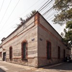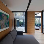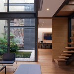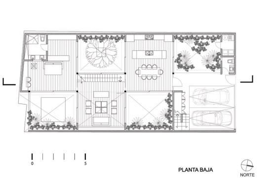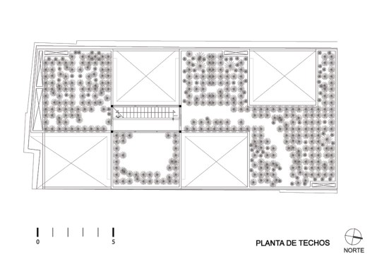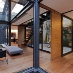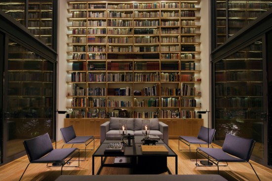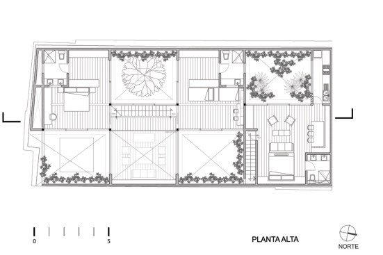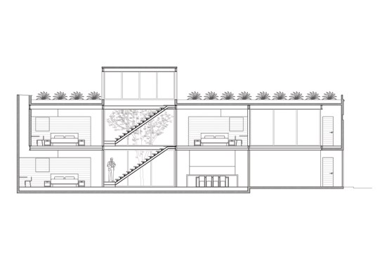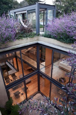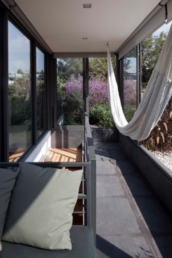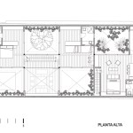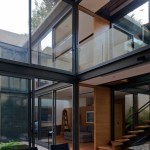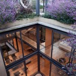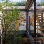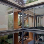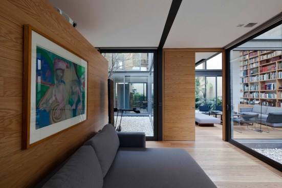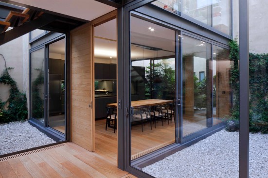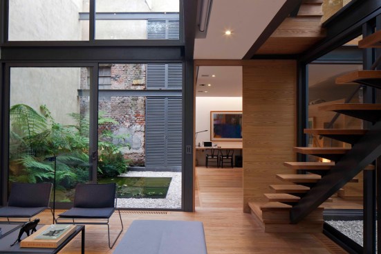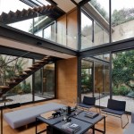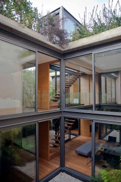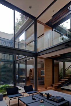 Located in a historic Mexico City neighborhood, the Cuatro Patios House by Andrés Stebelski Arquitecto is an unexpectedly modern interior stealthily inserted into a traditional masonry structure. The plan is arranged in a grid that alternates landscaped courtyards with spaces enclosed by steel-framed glass walls. The calm and composed interiors, with their wood paneling, contrast with the riot of textures and materials found in the four courtyards: the old plaster and brick of the original structure, pebble-covered ground planes, and flowering vegetation. These terrariums make the house feel both larger than it is, by framing views that extend through the courtyards and into the next room over, and more intimate, with delicate self-contained gardens right at hand. The two floors are connected via floating stairs, and bridges that cut through the double-height interiors to connect the second-floor bedrooms. A glass-enclosed rooftop patio holds a hammock from which residents can look out over a roof garden.