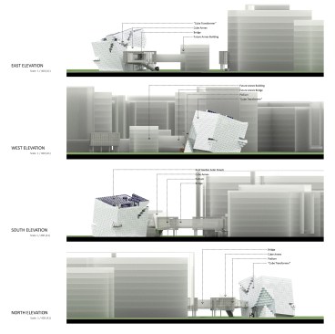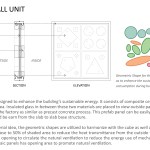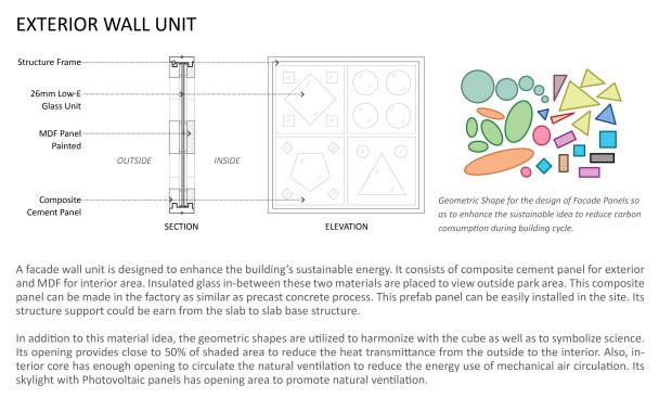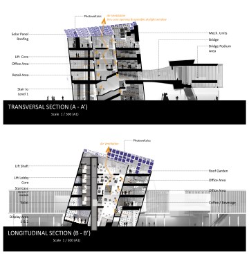 The “Cube” has been evolved in design process. It is transformed from its own form to another. In order to follow one of the required design elements, the form is oriented toward sun angles to maximize the absorption of the solar energy. The Sun will be utilized to generate electric power through the installed photovoltaic panels on tilted roof area. So, the entire electric consumption of the building will be covered through this system except retail and coffee area at level 1. The energy will be gathered to the battery installed at level 4 and level 5, and it will be closely connected to the Photovoltaic Panels installed on the same levels. In addition, inclined facade walls represent sustainable ideas of the material uses. It uses dual layered composite panels. The wall unit is combined with light weight precast composite panel at exterior, MDF panels at interior, and low-E dual glass in-between. It will limit the sun lights during day time and minimize heat transmittance to the interior space. Furthermore, exterior walls are transformed by its functional requirement for the use of rooms providing balconies and glass openings, and air ventilation openings at building core. Thus, the “Cube” is connected to another cube (Cube Annex). This is a transitional form to link the bridge podium (existing building design form) to the main ‘Cube’. This linkage not only amplifies the dynamic form of the Cube, but maintains the existing building design in harmony with the new icon as well.