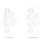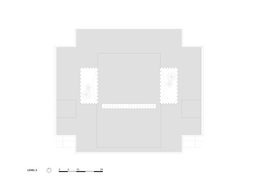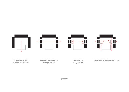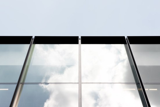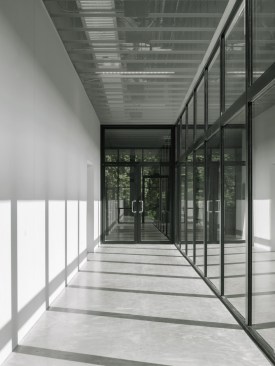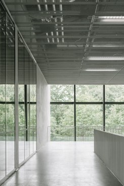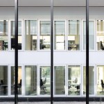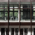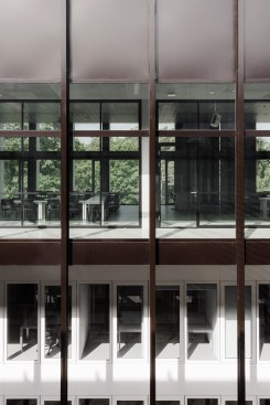 The auditorium surrounded by glass walls is part of this dynamic ensemble. Moreover, alongside the green patios, independent study spaces with lower ceilings are recessed, dedicated to concentrated work. On both floors, all fully-equipped lecture rooms run alongside the west, north and east facades highlighting the strong orthogonal orientation of CUBE.