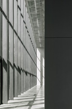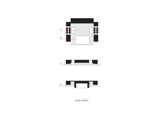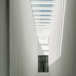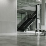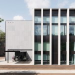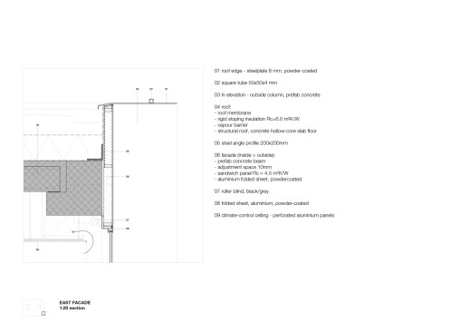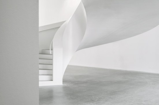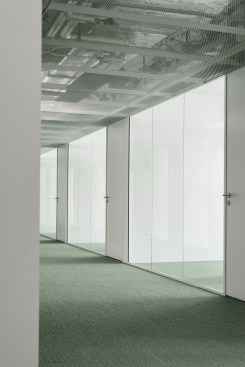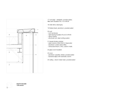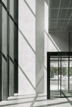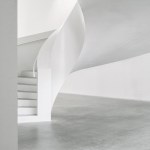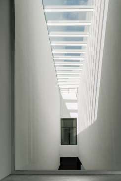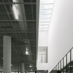 Spread symmetrically over the plan, four open staircases, including the main one, connect the indoor plaza to the first floor. With the exception of the main spiral staircase, all stairs and canopies are dark in colour, forming a common thread throughout the building, while all the public areas have power floated concrete floors and light grey expanded metal ceilings.