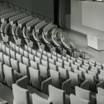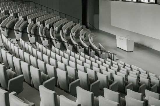 The auditorium has a warm, neutral interior. Floors, walls and ceiling are all ton sur ton – in welcoming shades of grey which create a unified spatial experience, suitable for the diverse typology of events it houses.