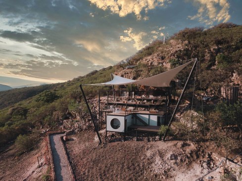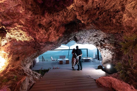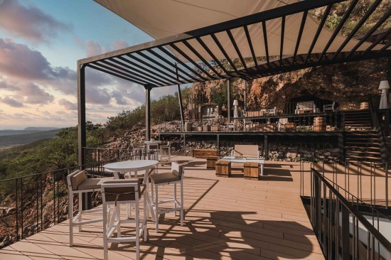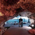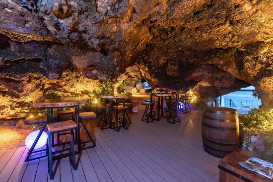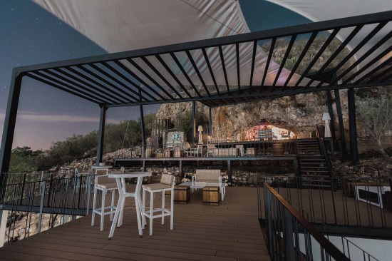The rustic and minimal furniture emphasizes the natural atmosphere of the space, as well as taking advantage of the strong natural light that enters through the mouth of the cave, contrasting with the artificial light.