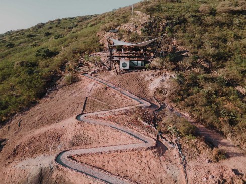 As in the interior, a series of floating platforms were proposed on the mountain, much larger than those in the cave, at different levels that descend parallel to the natural inclination and are intentionally placed slightly irregularly. Under one of these platforms the bathrooms and kitchen facilities for events were located. Finally, to protect people from the direct sun, a large candle was placed that also serves as a visual reference from a long distance.