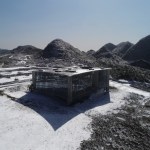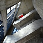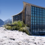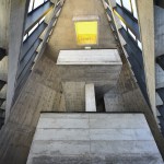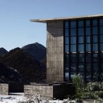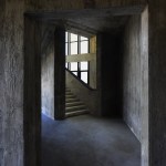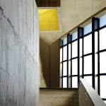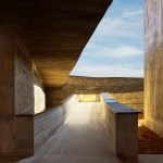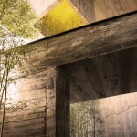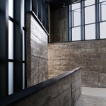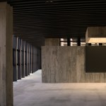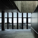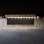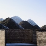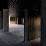 The construction system is based on concrete technology mixed with local sand. The sand mixture helps engrave the wooden texture given by the formworks, realized with recycled panels from declining Yi houses and local pine wood. The rough concrete interiors together with the black metal window frames and ceiling help frame the outdoor landscape, making it the protagonist of the interior atmosphere. The three floors are characterized by a free plan where two structural units combine all the main service functions; this spatial production mode derives from the so called ‘group technology,’ typical of Guizhou mountain villages. The indoor hanging courtyard, with its red and yellow skylights, creates a holy atmosphere and a sense of ritual space from the contrast between the colored lights and dark space below. The indoor atmosphere is kept dark on purpose so the outdoor bright scenery can stand out; visitors become silent wanderers of the wild grassland and are immersed in a suspended time as gazers of history.