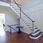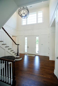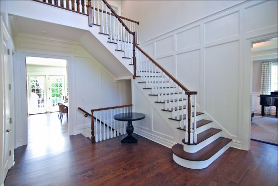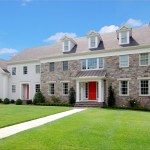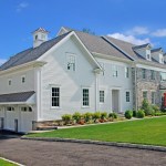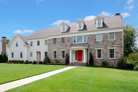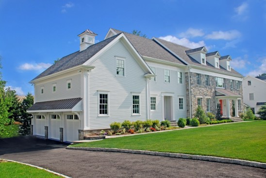 This is a 5000 SF house on a 1/2 acre lot designed for a young couple with 2 boys. It’s a classic center hall colonial with the main body of the house finished with stone veneer, while the garage & adjoining wing are finished with cedar clapboard siding. All windows on the main body of the house on the front elevation have precast concrete lintels & sills. The front entry was designed with square columns supporting a shed roof finished with standing copper copper, while the mud room entry is recessed so as not to compete with the front entry. The foyer, living room & dining room have paneled walls, making for an impressive entry. The kitchen, breakfast & family room are open to each other, with all opening onto to a south facing pergola covered bluestone terrace. Below this terrace is another terrace, partially submerged below grade. The second floor consists of a master bedroom suite along with 4 bedrooms and 3 bathrooms. A walk-up stair leads to the attic, which could possibly be finished in the future. The garage is a 2 story space, doubling as a basketball court & complete with a climbing wall & ropes. The basement consists of a play room, an exercise room, a study & another bedroom & bathroom.