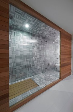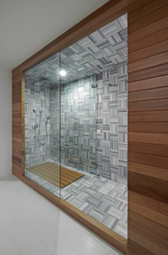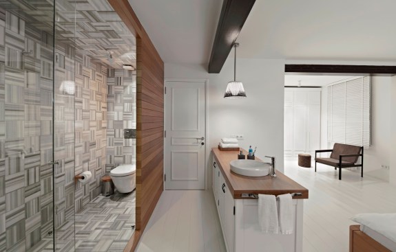 White staircases almost disappear in the total whiteness and simpleness. On the other hand the kitchenette and the shower/wc cabin on the ground floor pops out. The en-suite bathroom in here is designed as a built in corner, covered all around with the most traditional, common, regional marble Marmara, but in an unusual pattern and size of 15x15cm. One side of it designed as the shower area covered with clear glass, while the other side is more closed for the wc with a stained glass door imitating the marble patterns. The iroko deck wood on the facade helps to emphasize the cabin even more.