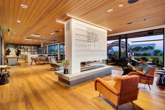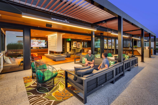 Healthy living and a strong connection to nature are evident in the main staircase. This welcoming, sunlit space overlooks a park, while natural materials – such as cedar and brick – evoke the building’s Pacific Northwest regional architecture. The indoors extend outside with trellises and covered seating areas scattered throughout. The roof decks and courtyard provide spaces for residents to lounge and enjoy framed views towards mountains in the distance.