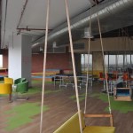 Cafeteria and training rooms can be combined to formspace for special events. Steeped OAT provides space for informal meetings. Entire ceiling for workspace is open with services creating design elements. The entire office is designed in shades of grey and white while artwork, fabric partitions and ceiling elements provide the colour and vibrancy.