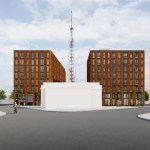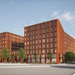 The resulting design includes two 7-story housing bars on a full-block, 2-story podium arranging ground-floor residential and amenity spaces around a central private courtyard.