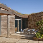 In order to conceal this home from its uphill neighbors a shelf was cut into the narrow slice of grassland located between an access road on one side and the steep slopes of the West Coast on the other. The uphill land extends as a green roof over the underground portions of the home-terminating on the gently curved roof of the living room.