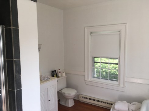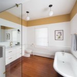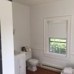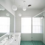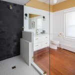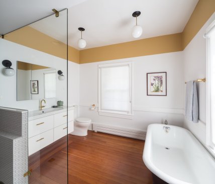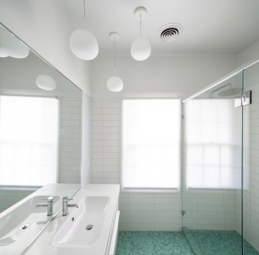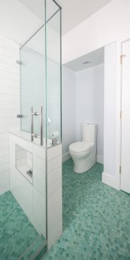 In this 1900's historic Italianate building, the owners wanted to bring the elegance and purity of the house into their bathroom, while also crafting a new, vibrant bathroom space for their children. In the main bath, focus was geared toward keeping the existing well-lit and inviting atmosphere, while drawing attention to the beautiful heart pine floor. The colors of the paint and tile are refined, a timeless white and light brown. The biggest challenge was integrating the shower to read as a cohesive part of the room. During design, the architect had to balance the practical need for tiling and water management in the shower with the look and feel of an open, simple, yet light-filled room. A geometric scheme which organizes the room into 2/3 open floor plan, 1/3 entry and shower area, creates a strong internal juxtaposition for a unique yet successful space. In the hall bathroom, the turquoise floor tiling immediately seizes attention as the rest of the room vanishes into a white glow. As a contrast to the legible materiality of the owner's bath, the hall bath masks everything above the floor in a glossy white, so that one steps out of the hall and is suddenly transported. Designed for two young girls, the bathroom is fun and interesting while still clean and respectable. The challenge was to find an atmosphere that was unique and different enough from the owner's bathroom, while maintaining a level of detail that the girls will be proud to grow up with, and the owners will be excited to share with guests. These bathrooms, though directly next to each other, evoke contrasting atmospheres in a spacial dialogue, reflecting the members of the family. Tailored to specific uses of the inhabitants, the bathrooms bring a level of personalization to the house that makes it unique and enduring for years to come.