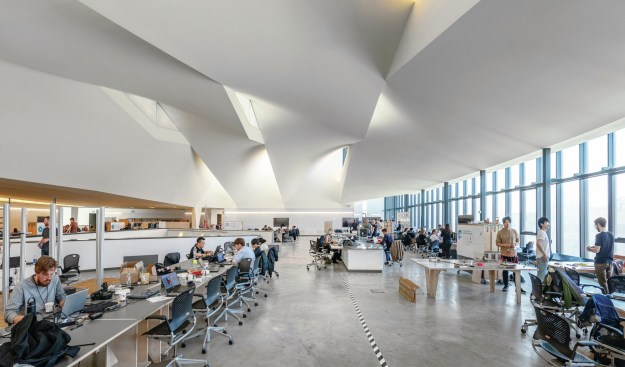 The entire building, in fact, offers large and small lessons for the students—from the adaptive reuse of a neglected property to the latest technologies that help minimize the use of resources in construction. “The idea of a pedagogical building is that it’s a space for teaching, but also a didactic instrument,” Tehrani says. “The whole building is an tool for them to pursue their research.”