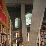 NADAAA relied heavily on the original structure’s substantial south-facing thermal mass for the addition: “Because the existing building is U-shaped, is serves as insulation that holds the addition in place,” says principal Nader Tehrani. “It gives us a very conservative loss of energy.” The firm also took inspiration from the high volumes and large windows of the original building for the three-story addition—especially on the top floor. The first two floors are encased in a concrete frame, but the roof is supported by a pair of steel scissor trusses, which create broad, light-filled spaces; the floor and roof slabs are precast void slabs, which have recycled plastic spheres set inside, and use 30% less concrete than traditional slabs.