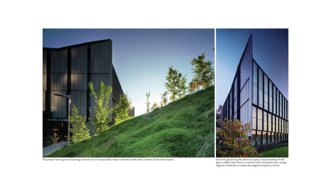 Given that site is surrounded on all sides by a busy traffic circle, pedestrians once took their lives in their own hands just trying to get to the building. “It was very disconnected from campus and the surrounding neighborhoods,” says Marc Ryan, a principal and co-founder of Public Work, which oversaw the landscape renovation for the project. “Part of our agenda was reconnecting it.” That meant, first of all, expanding sidewalks and pathways—including a pedestrian walkway between the old building and the addition—so that people can pass through the site. It also meant creating different green spaces around the building, including an expansive lawn on the south side and an 18-foot-tall rise covered in native plant species to the north. “The landscape is a major player in the overall design,” says Richard Lee, an associate at NADAAA. “The landscape and the building often seem to be playing off one another.” A 365-cubic-meter (96,422-gallon) cistern under the green allows the site to achieve a 100% stormwater retention rate. Several of the pathways are surfaced in a permeable bonded gravel—the sort of innovation intended to showcase the role of new technologies in sustainable design.