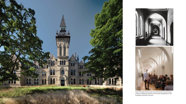 The revamped building is two pieces stuck together—the original, U-shaped Gothic pile and the sleek-lined addition, which nestles inside the U. ERA Architects, a local firm that specializes in historic preservation, assisted in the rehabilitation of the original structure, which involved installing a modern HVAC system and high-performance windows. The architects played to the building’s advantages, including its high ceilings and abundant natural light: “As much as possible, we wanted to maintain those existing features,” says Andrew Pruss, a principal at ERA.