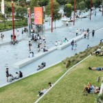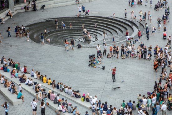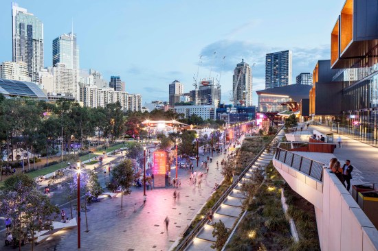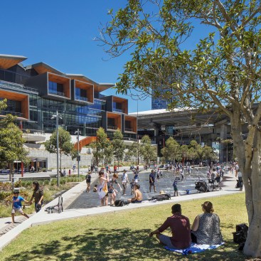 By reinvigorating parklands, integrating landscapes and open space and incorporating water features, public artworks, plazas and event spaces, HASSELL has created opportunities for events and activities as varied as open-air concerts, circus events, market stalls and busking – and simple pleasures like splashing in shallow pools.