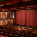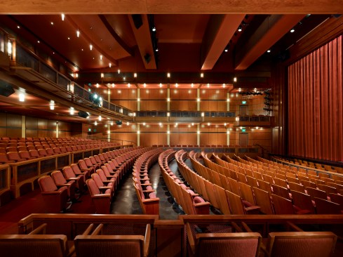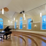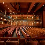Designed for flexibility and multiplicity of use, the chorus room doubles as a cabaret space. The main theater is designed with teaching students in mind. Two levels of balconies “people” the walls. With the furthest seat from the stage at 55 feet, this promotes an intimate relationship between performer and viewer even with a full house. The balconies can be darkened for smaller audiences without the house feeling empty. An added advantage to this configuration is the opportunity for antiphonal music and interactive theater. The orchestra pit lift, at its highest position, acts as a stage trust.