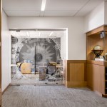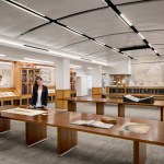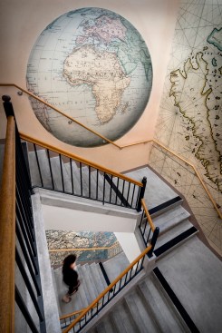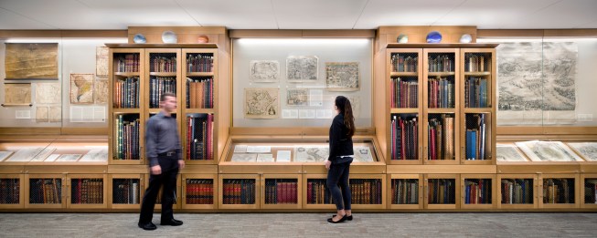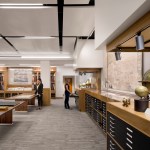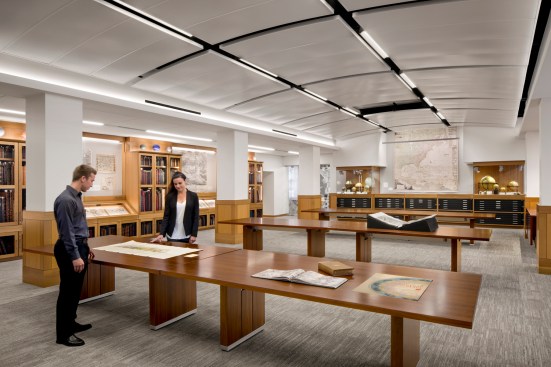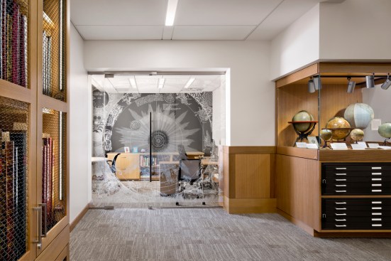 The project renovated the fourth floor of Stanford University’s Green Library to house David Rumsey’s rare map collection, begun more than 30 years ago. The design integrates Mr. Rumsey’s collection with his dedication to providing an accessible and interactive experience through visualization and geospatial technologies. The design weaves the stunning visual impact of the maps into the experience of the built environment. To reach the Center, the visitor ascends three flights of stairs from the library rotunda. The stairwalls are wrapped floor to ceiling in maps – from an isometric map of Manhattan to a map depicting the heights and lengths of the world’s mountains and rivers. Inside the Center, glass doors are decorated with white digital prints of maps. On the east wall, a custom display presents the Popple Map (1733), the first large scale map of North America, a prize of the collection. The design allows for incredible versatility of the exhibits, with two 16’ x 8’ walls of uninterrupted display, cases that allow globes to be exhibited and easily interchanged, and custom-made shelving and casework to house the collection. To make the technological element of the collection accessible to researches and laypersons alike, there are two large touch screens (7’x12’ and 9’x16’), which allows users to create, overlay, and visualize cartographic materials through technology that encourages interdisciplinary cross-fertilization of research. It is the university’s goal that this center’s physical materials and data-based tools will forge new paths of study and instruction in the cartographic and geospatial realm.