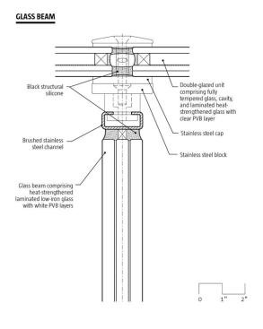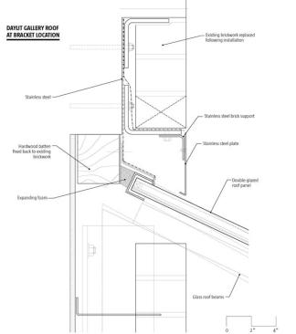 Each glass beam is supported by a steel bracket concealed within the masonry wall. Strategically, MUMA’s detail provided a way for masons to conceal the brackets and work beneath the line of the installed glass roof.