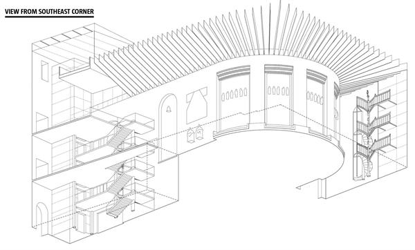 Along the gallery’s edges, sunlight renders the historic façades in crisp highlight and shadow. The pitch of the heat-strengthened, laminated beams—which varies from 20 to 40 degrees—and the rhythm provided by the roughly 30-inch spacing between them gives the impression of a softly glowing, wavelike ceiling overhead. Along one edge, the glass beams sail cleanly over the semicircular parapet of the adjacent East Hall apse; opposite, they slice into the brick-and-stone façades of the Perimeter Galleries. By stitching together six floors of galleries into a coherent exhibit sequence, MUMA provided wheelchair access and daylight where none existed previously.