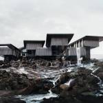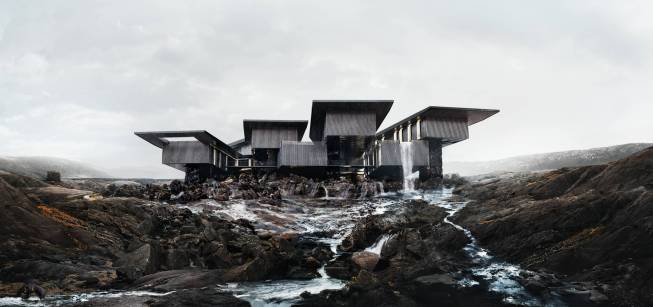 An architectural illustration of a stunning hotel in Iceland. Located in a waterbed of a small mountain stream, it channels stillness and much-needed solitude.