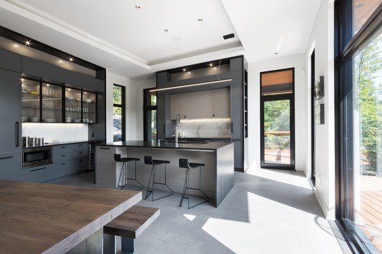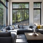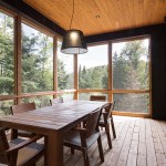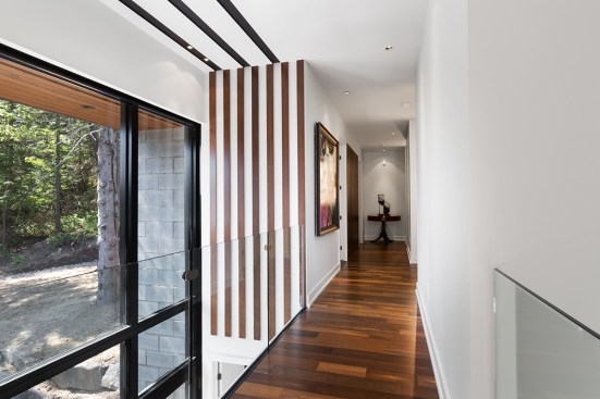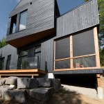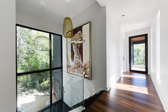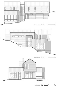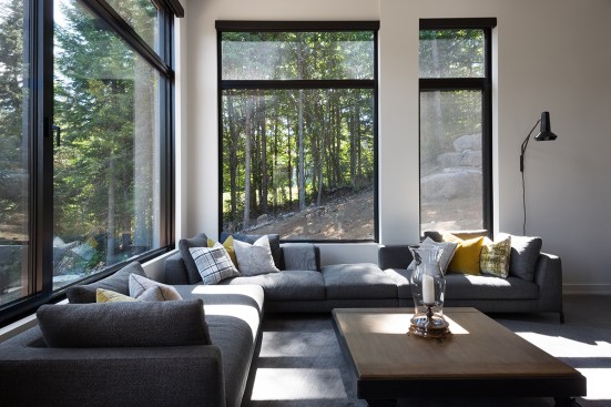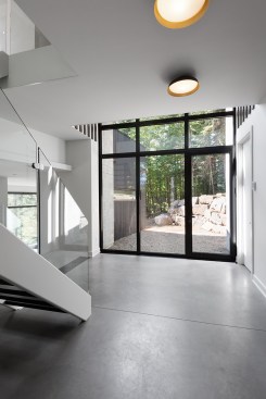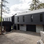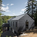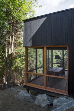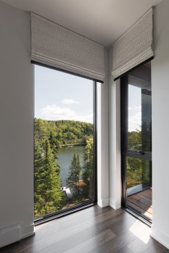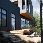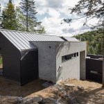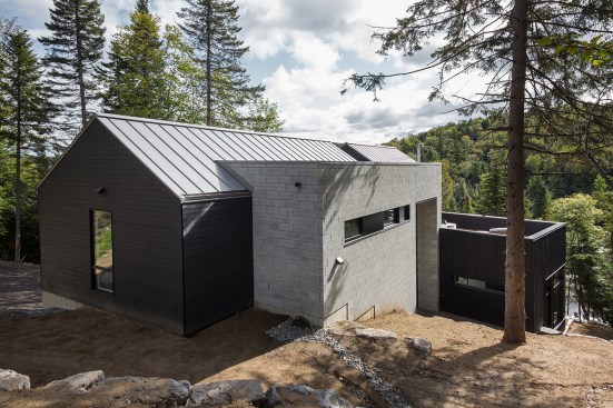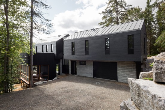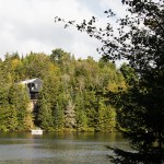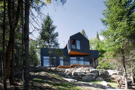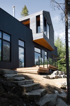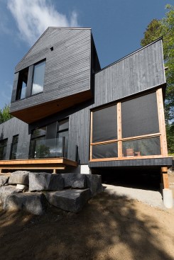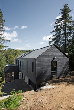 This residence was designed to enable a sister and brother to meet as a family on special occasions and to unwind in contact with nature. This project sprouted along the shores of a lake up in the Laurentians in a wooded area with a significantly consistent slope. This elevation, which offers a bird’s eye view of the lake, is the backbone for the development of this architectural concept—grasping hold of the land through the blending of two areas intersecting one another. The parcelling out of its shapes made its integration with the landscape possible. Its establishment forms part of a circuit throughout a site where paths extend internally, creating views, such as observation posts towards the surrounding landscape.