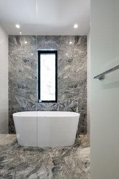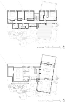 The lower floor has a more contemporary shape with its flat roofs and very large openings. The living space, which is arranged on two levels, takes advantage of plunging views onto the lake. On one end, a large screen shelter completes the lower area. A wide terrace is arranged on the roof at the other end.