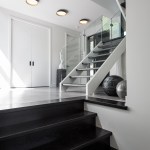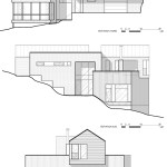 The upper area, which takes on the shape of a distinctive gabled-roof house, looks out to the lake through a cantilever, while the lower area anchors to the slope. Both areas are sliced at their intersections to give way to vertical circulation and to the entrance hall below. This pivot space organizes the entire internal circulation area and enables the core of the building to connect with the outside.