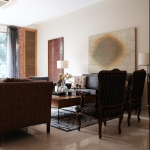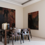The interiors are finished in muted tones of white. The regular dark tones of wood finishes were eschewed in favour of the blonde, honey coloured quality of oak wood and a similarly light cream coloured stone has been used to create a neutral, yet domestic backdrop to the art on display. A structural wood stair, dramatically lit from below, descends to the basement from within the house. On the terrace, a deep verandah opening onto the garden makes a relaxing space for evening dining. The walls are raised to avoid the unsightly views and the only thing that can be seen is the sky.
