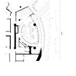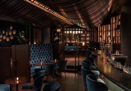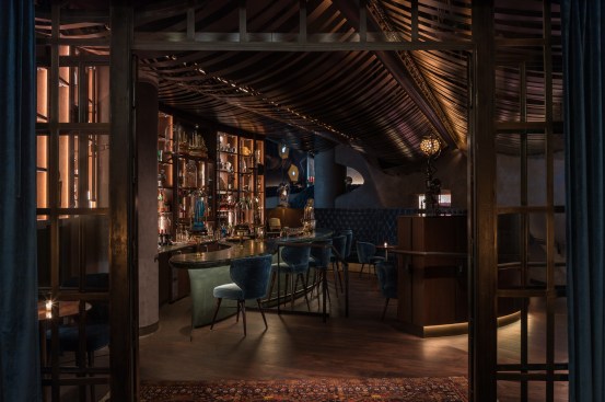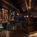Inside, a gently sloping ramp brings guests into a sophisticated environment eschewing minimalism, favoring a rich array of materials and objects. The floor plan mirrors the complex space with a curved, tufted velvet banquette, and gently curved bar. The intimate 1,677-square-foot space is wrapped in wood, punctuated by shelves, niches, and cloches, supporting an array of natural objects and assorted artifacts, transforming the space into a veritable cabinet of curiosities. The setting unfolds as a series of vignettes; entry, bar seating area, and library.