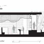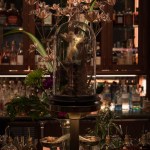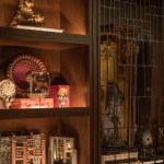 Overhead, the ceiling is composed of a custom-designed array of suspended steel “ribbons,” which add drama to the space, while simultaneously concealing the existing mechanical equipment which dips into the space. Velvet covered occasional seating, small cocktail tables, and antique furnishings round out the space. The library, separated from the primary bar by a steel-framed and glass paneled wall, and furnished with an eclectic mix of antiques, provides a private space for small gatherings. Carpets, drapes, luxurious fabrics, and dark woods (stained ash, oak, and walnut), custom metalwork handrails, and decorative panels round out the space.