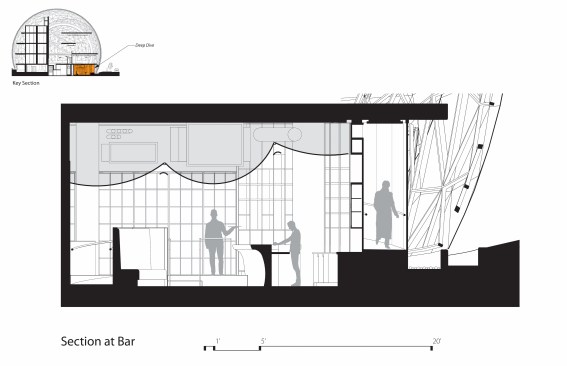 Deep Dive is created out of one of three residual spaces located between and below the spheres (Graham Baba also designed Understory, the multipurpose exhibit venue that occupies one of the other two spaces). “When you descend, you enter into this dark relic that’s tinged with a sense of Victorian magic and mysticism,” notes lead architect Jim Graham of Graham Baba Architects. The design embraces its inherent spatial limitations: small scale, varying ceiling heights, and complicated shape. “It’s a small place with complex geometry. It was like fitting out a boat,” Graham adds.