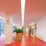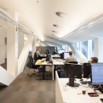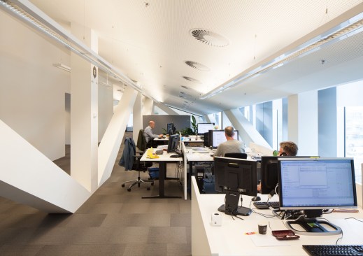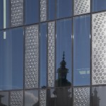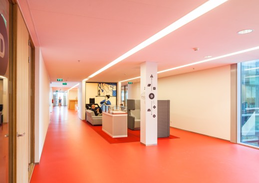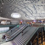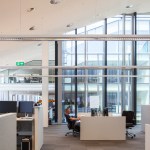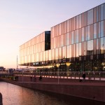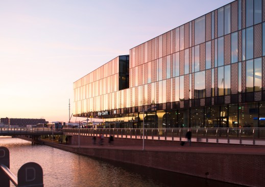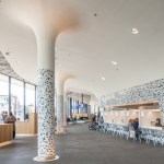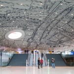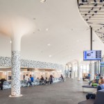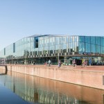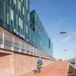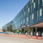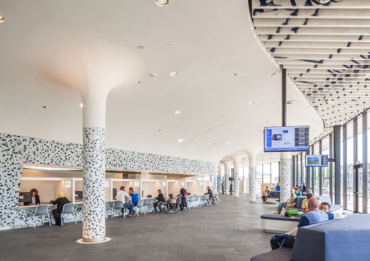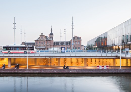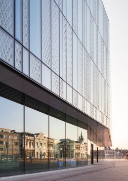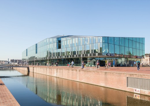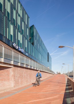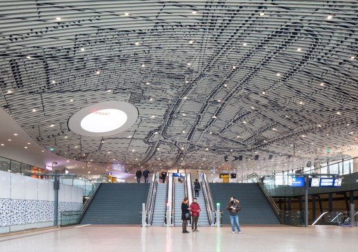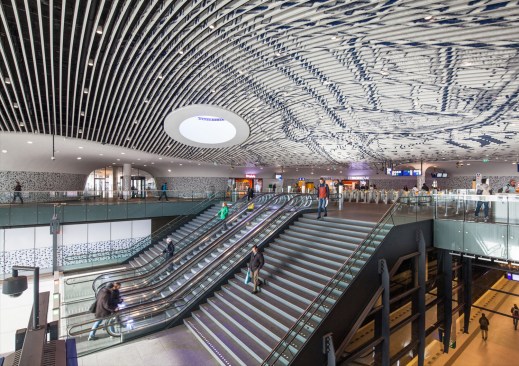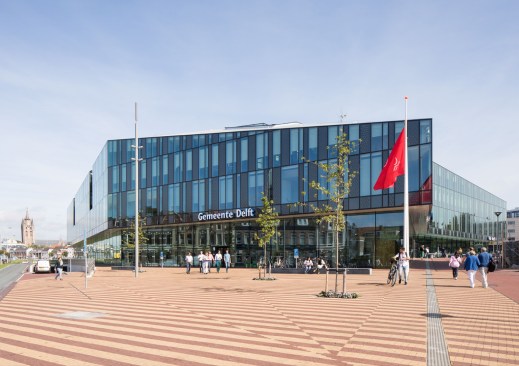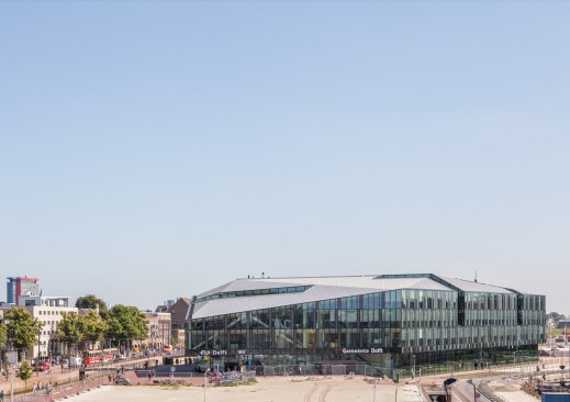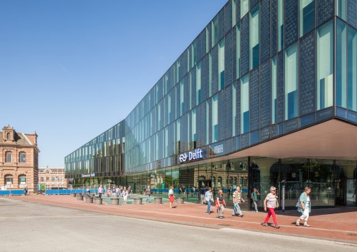 Arriving in Delft is an unforgettable experience. From the outset, Mecanoo’s idea was to design a station that makes it clear to visitors that they have arrived in Delft. The station, in combination with the new city hall, sits atop a new train tunnel built in place of the old concrete viaduct that divided the city in two since 1965. Coming up the escalators, the impressive ceiling with the historic map of Delft unfolds (in collaboration with Geerdes Ontwerpen). When you look outside, you see the city and the old station as a contemporary version of Johannes Vermeer’s painting ‘View of Delft’. A vaulted ceiling features an enormous historic 1877 map of Delft and its surroundings, connecting the station with the city hall. Within the station hall, walls and columns are adorned with a contemporary re-interpretation of Delft Blue tiles. You can walk directly from the station into the city hall. Throughout the design process, the building volume has been shaved and reformed to create a compact, highly efficient building form. The lowered roof lines at the corners provide a gradual transition towards the existing small-scale development of the Delft city centre and the adjacent Wester Quarter. Incisions in the glass volume of the city hall building form a pattern of alleyways and courtyards, which are themselves inspired by the intricate structure of Delft. The facade responds to the different sun orientations, which determined the amount of glass incorporated, thus mitigating daylight needs while reducing heat gain in the summer months. The glass has a high light absorption factor but low solar absorption, and all windows can be opened manually for user comfort and natural ventilation. Solar panels on the roof provide 20% of the energy for the building mechanics and presence-aware lighting. The GreenCalc+ score is rated at 270.