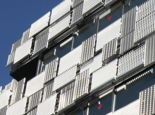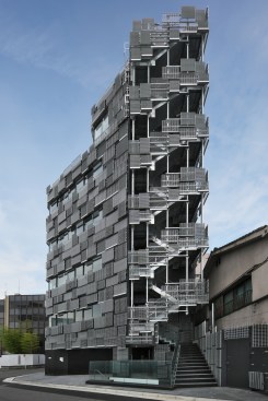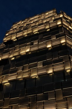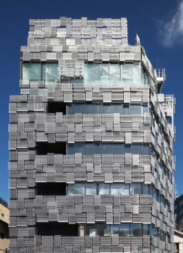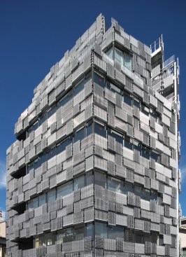 With 850 panels of aluminum grating that have different sizes and patterns and are combined as mosaic, we tried to translate the humane and unsorted atmosphere of this vibrant district alongside the canal into architectural vocabulary. Normally, multipurpose buildings in big cities are treated unfavourably. However, with the application of the industrial material as the particle, we succeeded in giving a fresh expression of “noise” to the building