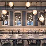 In order to make the traditional view modernised and the asymmetrically distributed woodworks have the same sense Caglayan Architects used shades of grey. A magnificent lighting located in the center of the restaurant, is placed as the display of the harmony that is consisted of modern and traditional harmony and the identity of the restaurant.